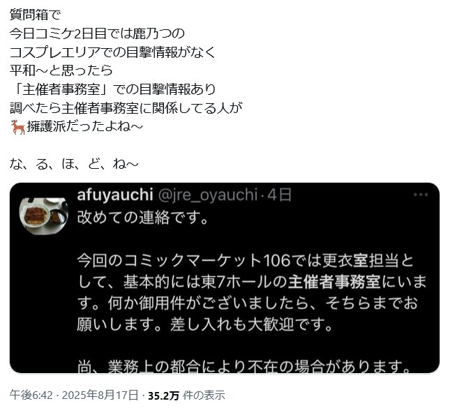 | … | 58無念Nameとしあき25/12/29(月)21:01:11 IP:133.106.*(ipv4)No.1376475909そうだねx5まぁ今のコミケ自体が腐卵や界隈連中と繋がりズブズブだからね |