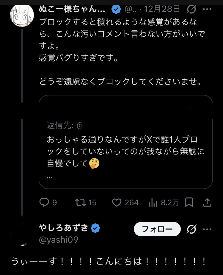 | … | 12無念Nameとしあき25/12/29(月)20:26:22 IP:133.106.*(ipv4)No.1376465549そうだねx1>お仲間かも知れないよ…フォロワーをチェックするの |