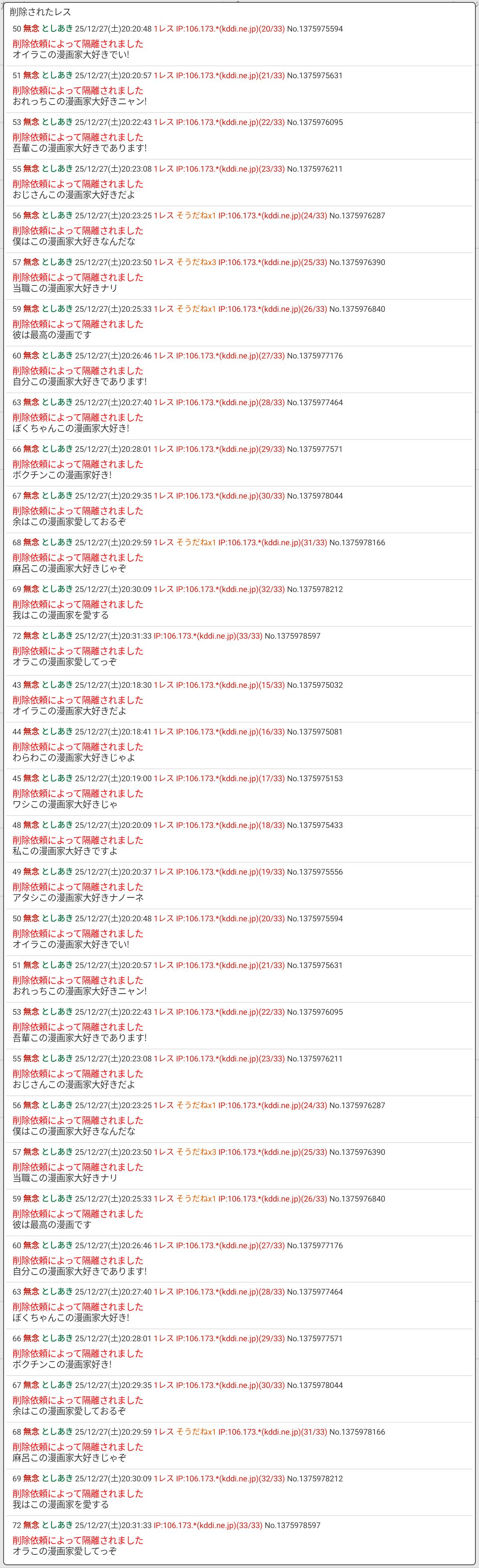 | … | 45無念Nameとしあき25/12/29(月)20:51:41 IP:133.106.*(ipv4)No.1376472923+>スレ隔離できなくなってるから巻き添え狙いで荒らしてるのが年末でも酷いのがなぁ |