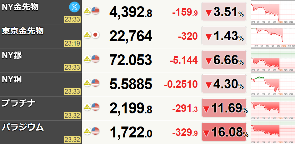 | … | 77無念Nameとしあき25/12/29(月)23:43:31 ID:4ExCI5l2No.1376519900+>貴金属が大暴落よー! |