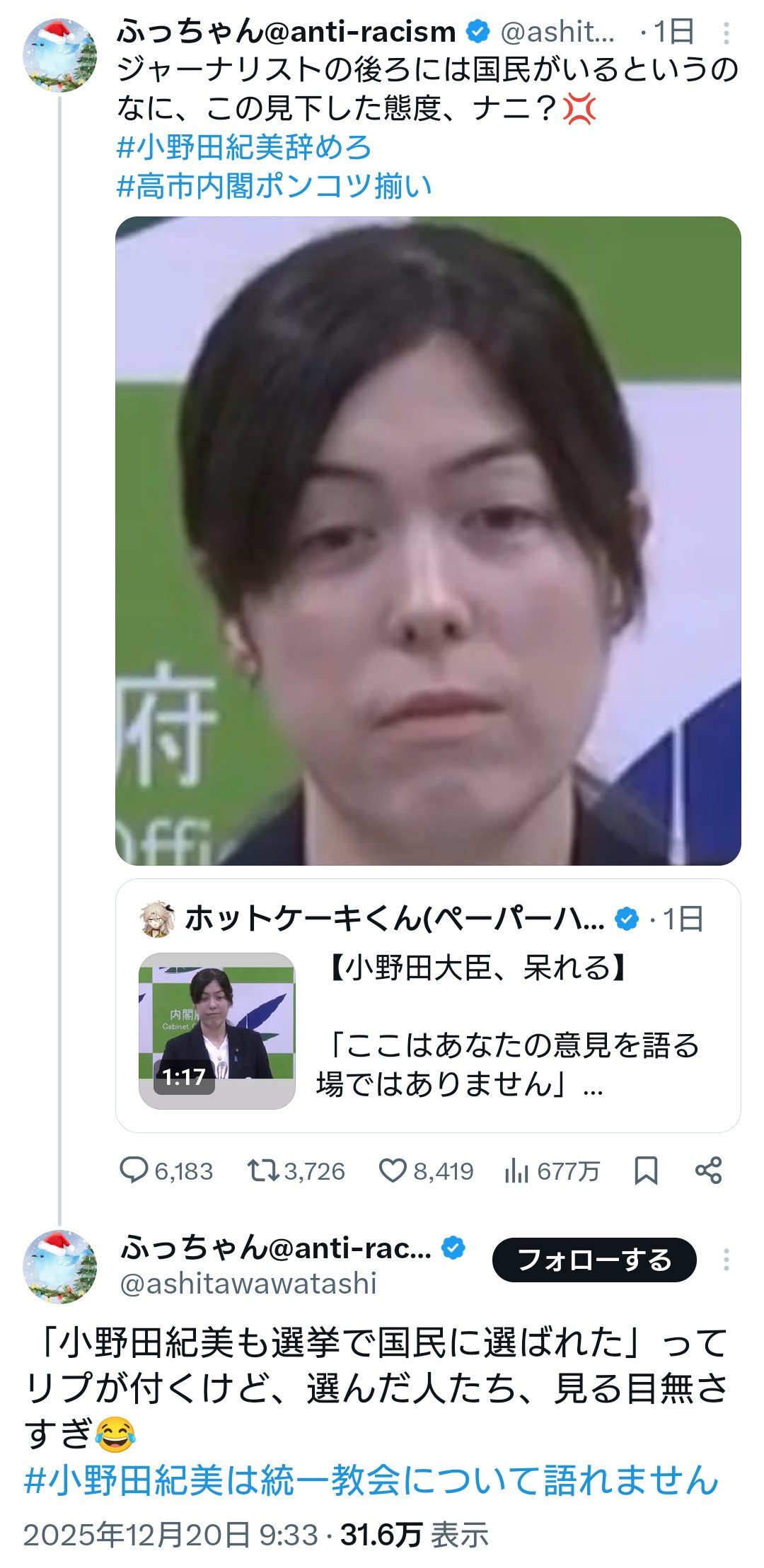| … | 160無念Nameとしあき25/12/31(水)20:13:53No.1376953854そうだねx3>小野田紀美、自民と統一教会の癒着を問われ逆ギレ「所管外だ!ここはあなたの意見を語る場所ではない!」 |