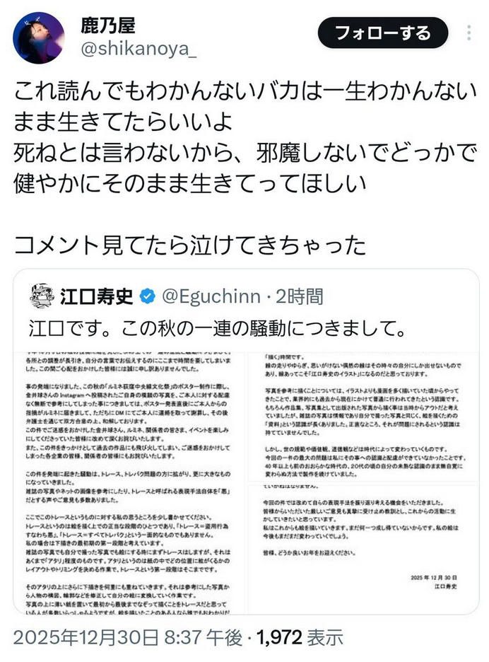| … | 37無念Nameとしあき25/12/31(水)19:35:26 IP:106.146.*(au-net.ne.jp)No.1376942553そうだねx6>トレパクなんてせずに面白い話を作れば自然に売れるのに |