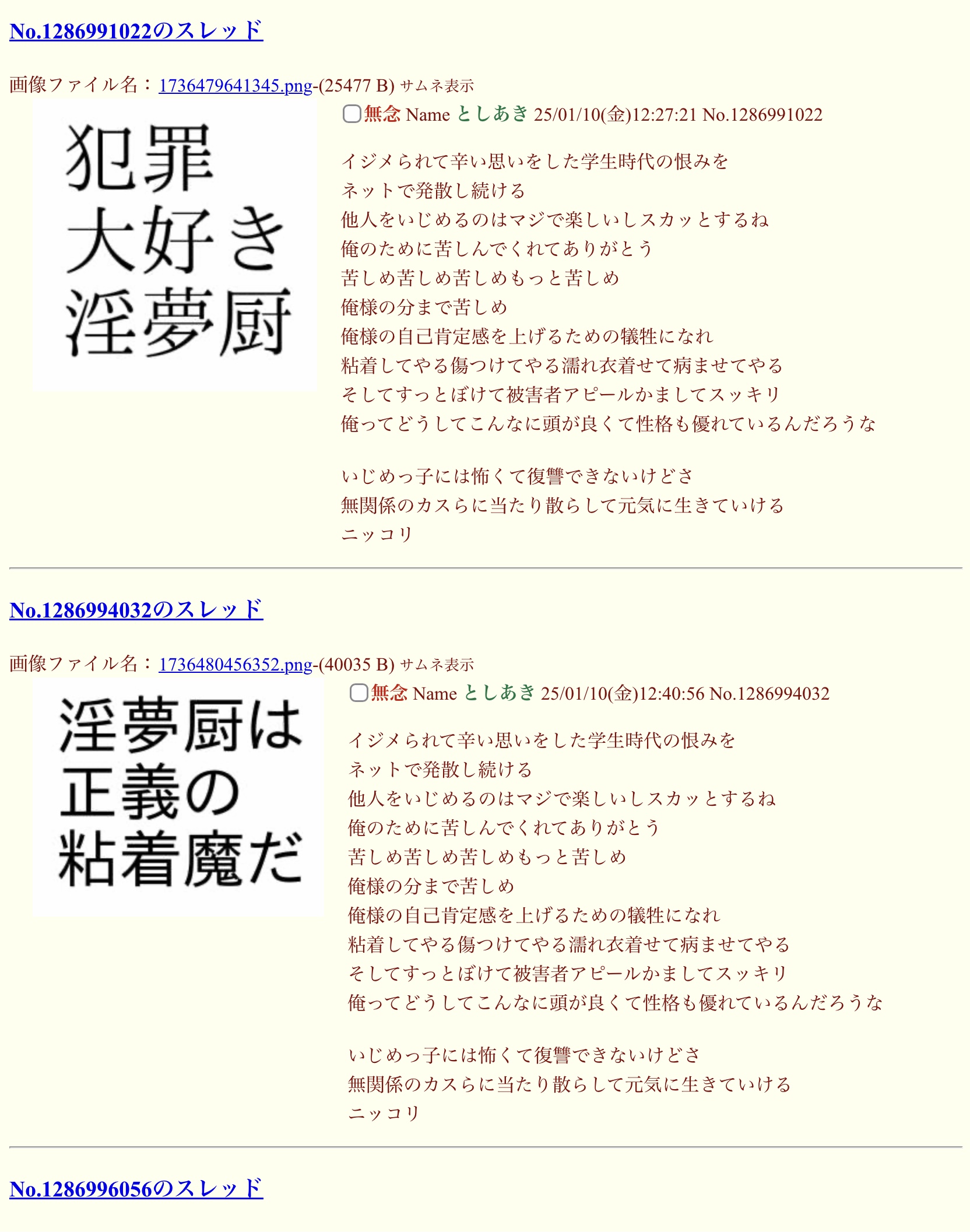 | … | 12無念Nameとしあき25/12/31(水)19:01:01No.1376932908+殺害予告性犯罪者河村ヤッチャイが建てているクソ乞食スレ |