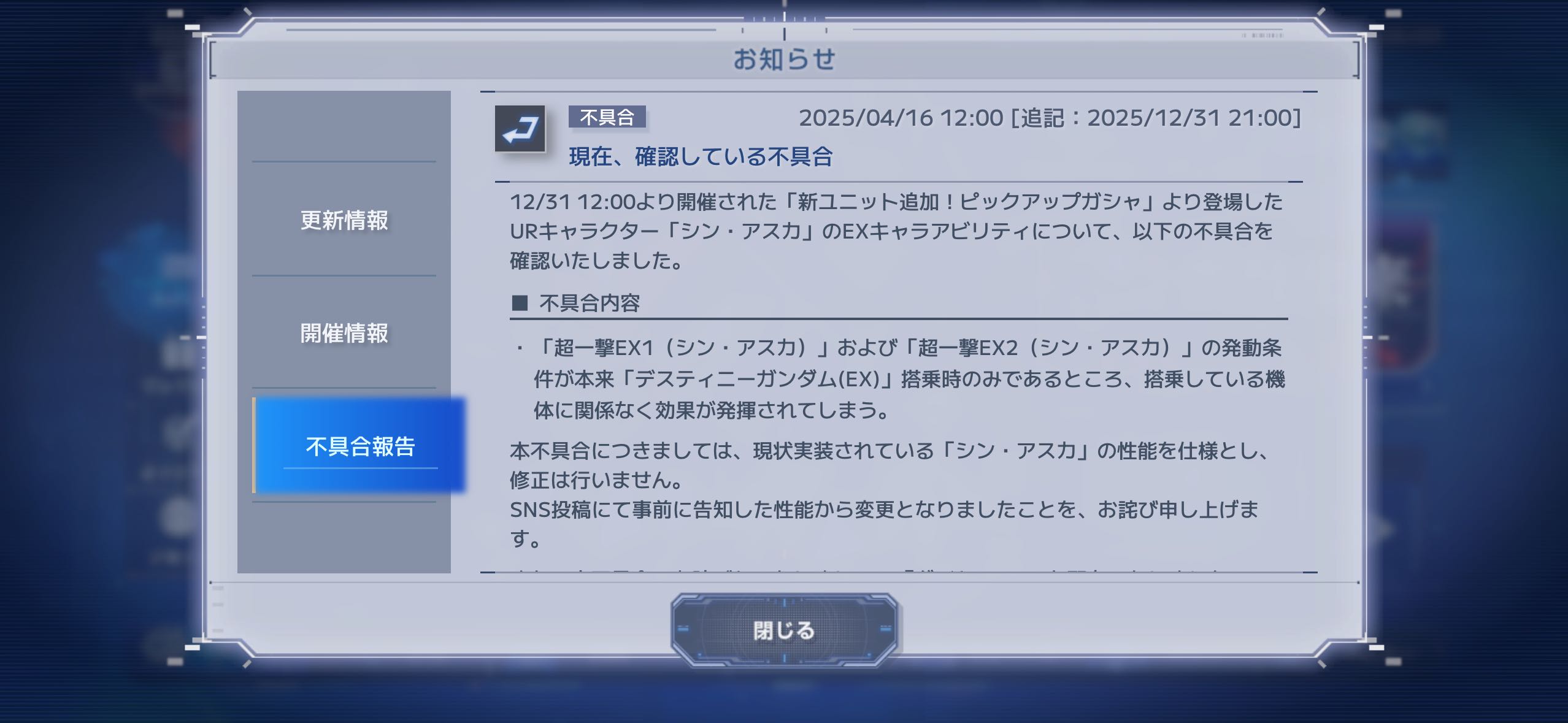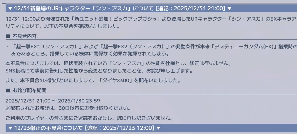 | … | 52無念Nameとしあき25/12/31(水)21:27:36 ID:3wNOkk/.No.1376976332+あーシンが他の機体でも超一撃EXになれるの不具合だったのか |