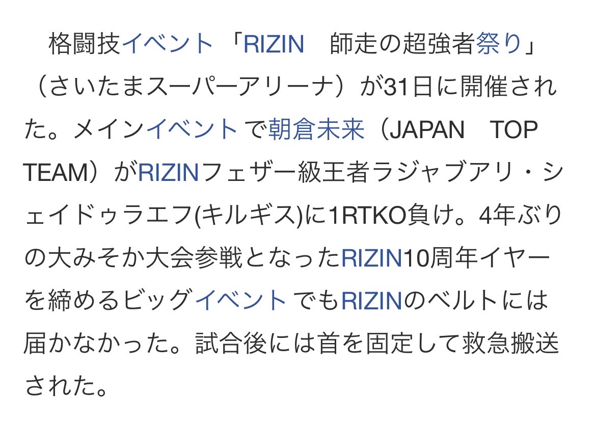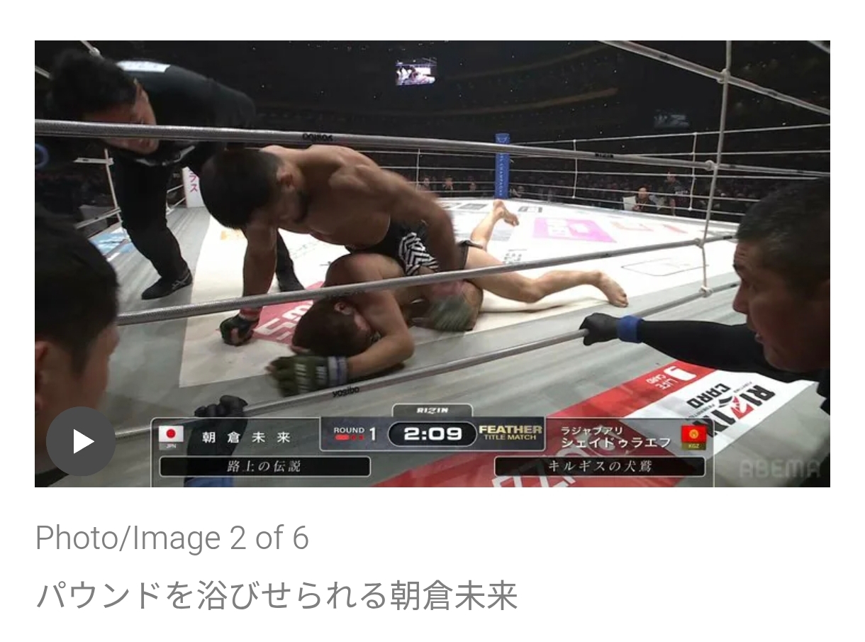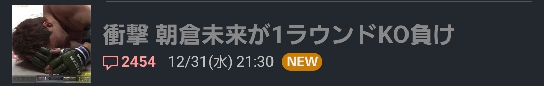 | … | 558無念Nameとしあき25/12/31(水)23:18:33No.1377015681そうだねx2【RIZIN】朝倉未来が救急搬送…試合後に担架で運ばれるも意識&反応あり 王者に衝撃1RTKO負け |