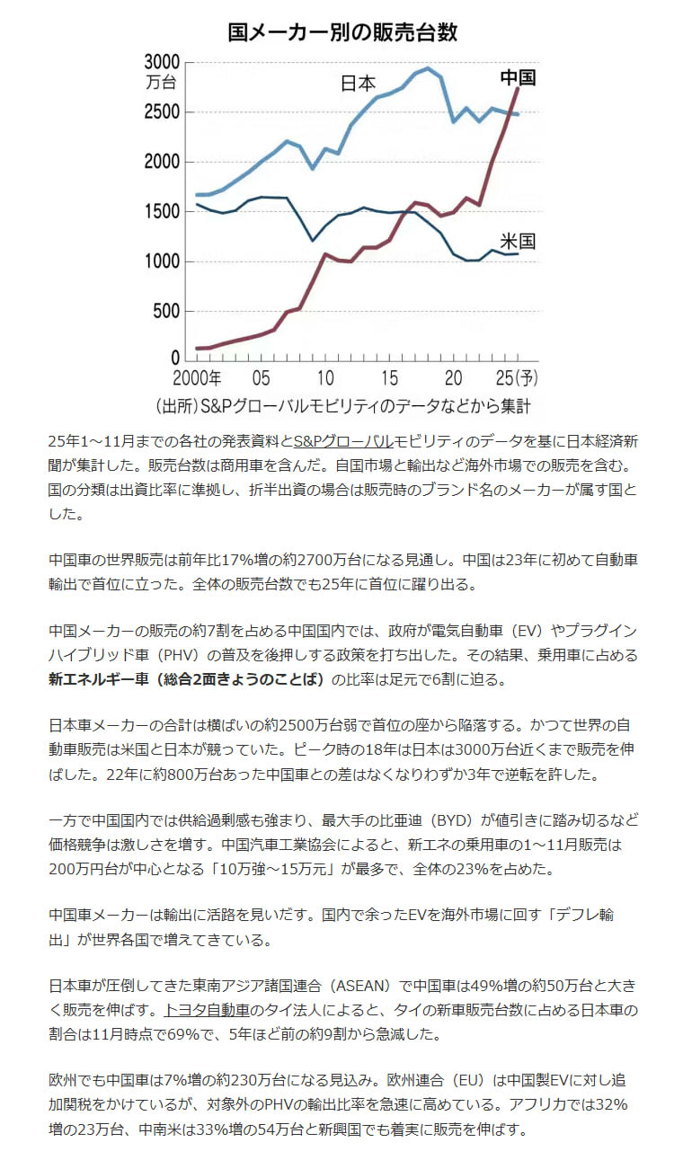 2025年新車販売で中国車メーカーの世界販売台数が初の首位になる。米国を抜き20年以上首位だった日本車は2位になる。中国は自動車輸出が既に首位で自動車大国としての地位を確立する(日経新聞)。