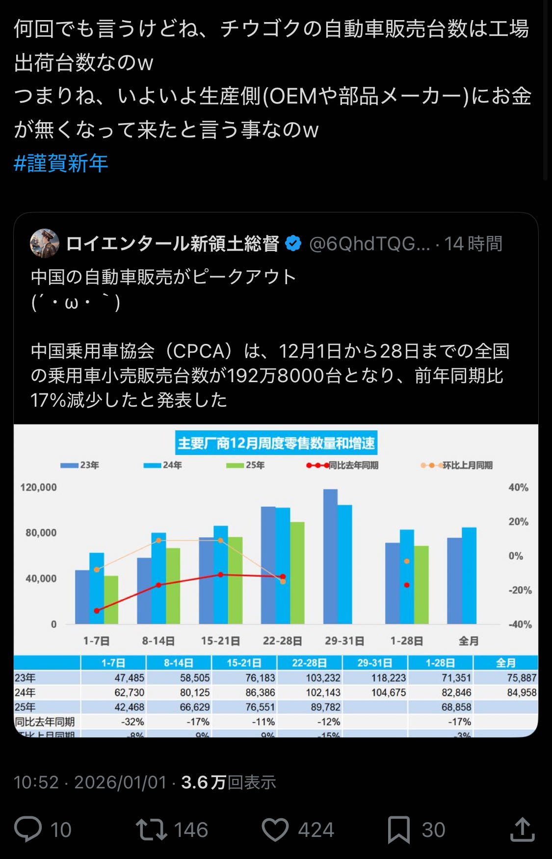 | … | 76無念Nameとしあき26/01/01(木)22:40:46No.1377258925+>Toyotaが6年連続でまた2025年新車販売数一位だからって幼稚な印象操作してんな中国も |