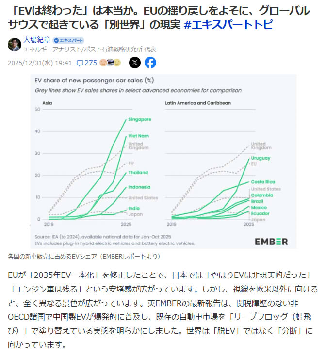 | … | 384無念Nameとしあき26/01/02(金)00:18:08No.1377280953+まあ盗電が蔓延る途上国とかEVが圧倒するとか夢物語だし |