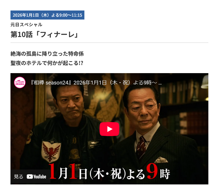 | … | 965無念Nameとしあき26/01/01(木)22:52:30No.1377261782+前の事件絡みなら昼間に再放送しときなよテレ朝さん |