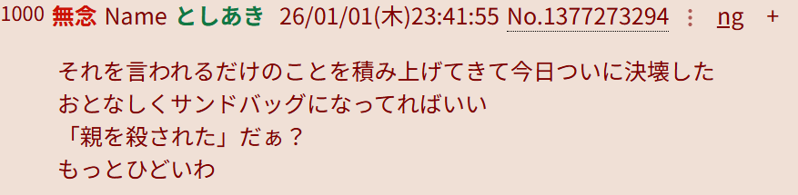 | … | 4無念Nameとしあき26/01/02(金)00:17:32No.1377280811そうだねx2>前スレの1000が気持ち悪くて保存しちゃった |