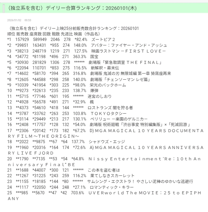 | … | 70無念Nameとしあき26/01/02(金)01:25:33No.1377293407+館数より回数が少ないのはトラブル発生or入場ゼロだったので上映しなかったのかな |
