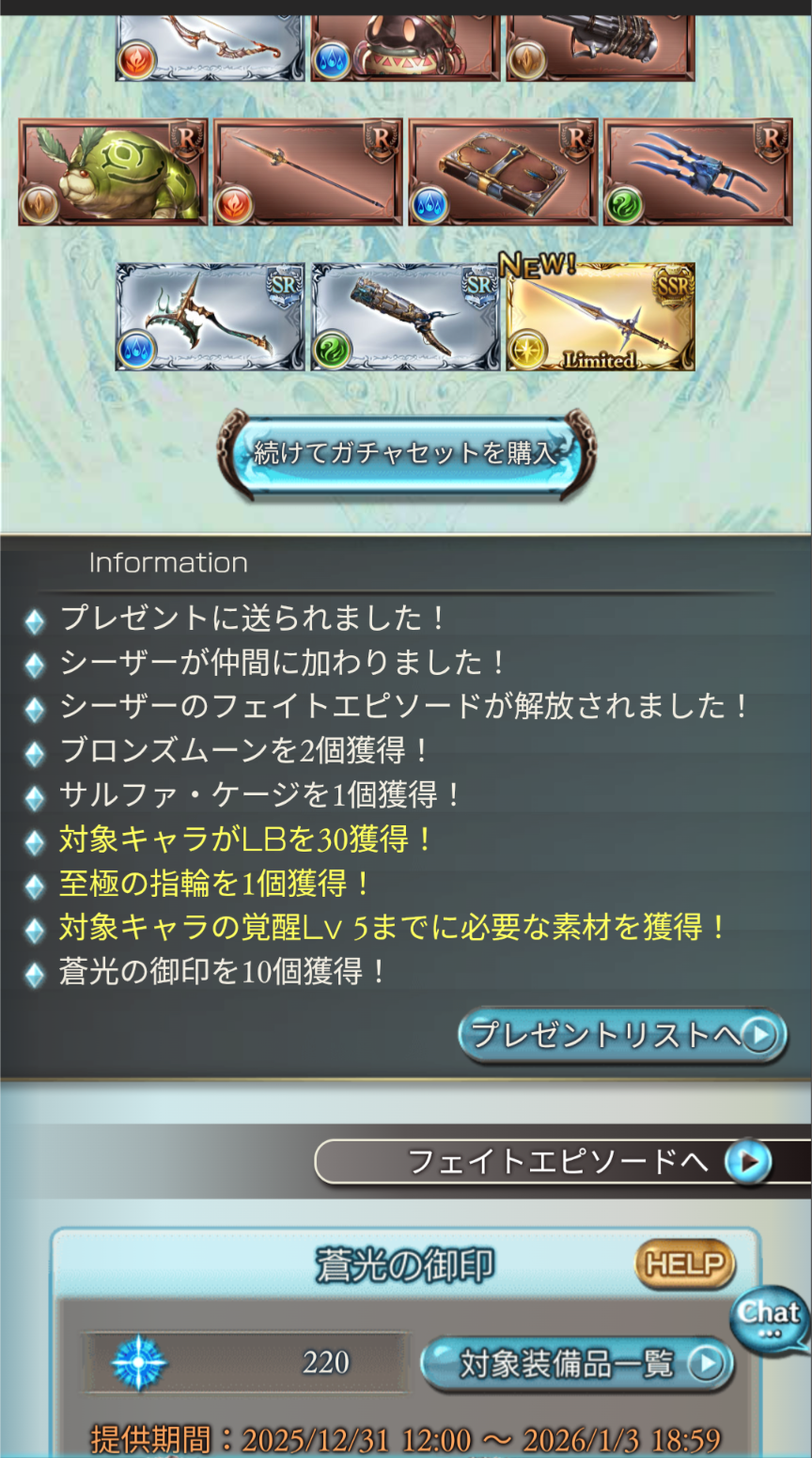 | … | 162無念Nameとしあき26/01/02(金)07:32:11 ID:yEW3EswcNo.1377312383+10連だったけどシーザー剣2本目出た |