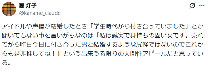 | … | 30無念Nameとしあき26/01/02(金)19:17:30No.1377439378そうだねx4学生時代からの彼氏と結婚は人気女性声優さんの発言となるとまぁまぁ異例ではないかな |