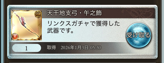 | … | 369無念Nameとしあき26/01/03(土)06:11:23 ID:Hd.A2s4oNo.1377544304+サンチラの弓2本出たけど |