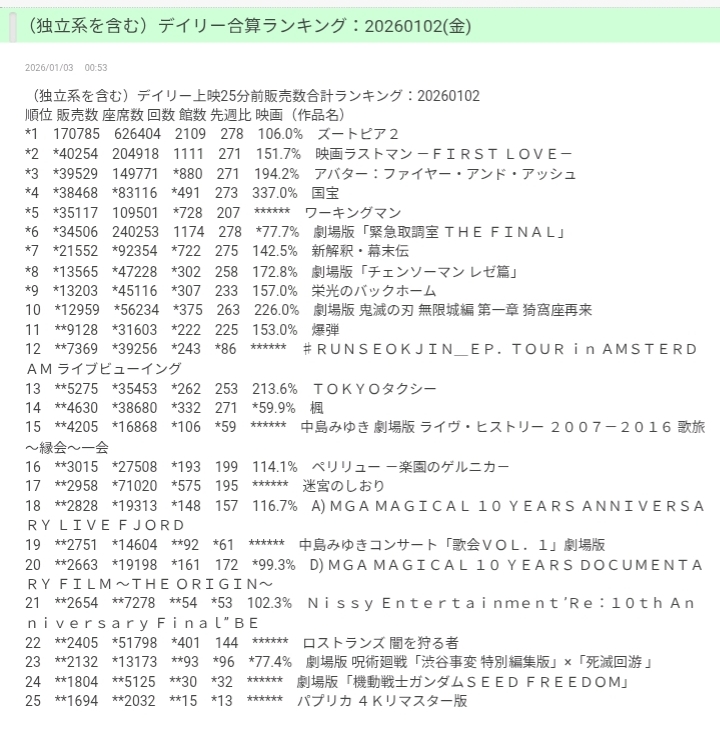 | … | 163無念Nameとしあき26/01/03(土)06:48:38No.1377545835そうだねx3 1767390518277.jpg-(158777 B) >とりあえず配給より映画館の着席率低すぎてそっちの方がヤバそう |