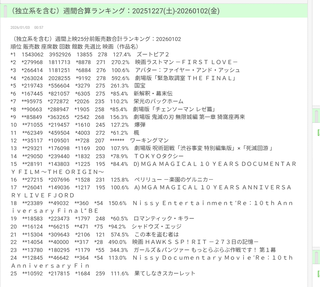 | … | 142無念Nameとしあき26/01/03(土)06:17:41No.1377544532+>正月映画の大本命の快進撃が続くな |