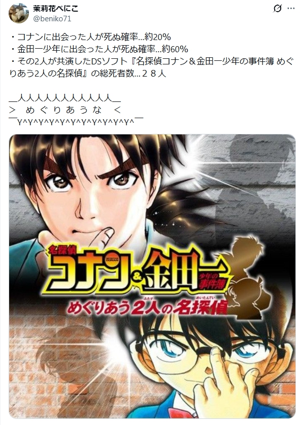 | … | 698無念Nameとしあき26/01/03(土)07:02:25No.1377546441+コナンや金田一とエンカウントした時の生き残る方法はただ一つ |