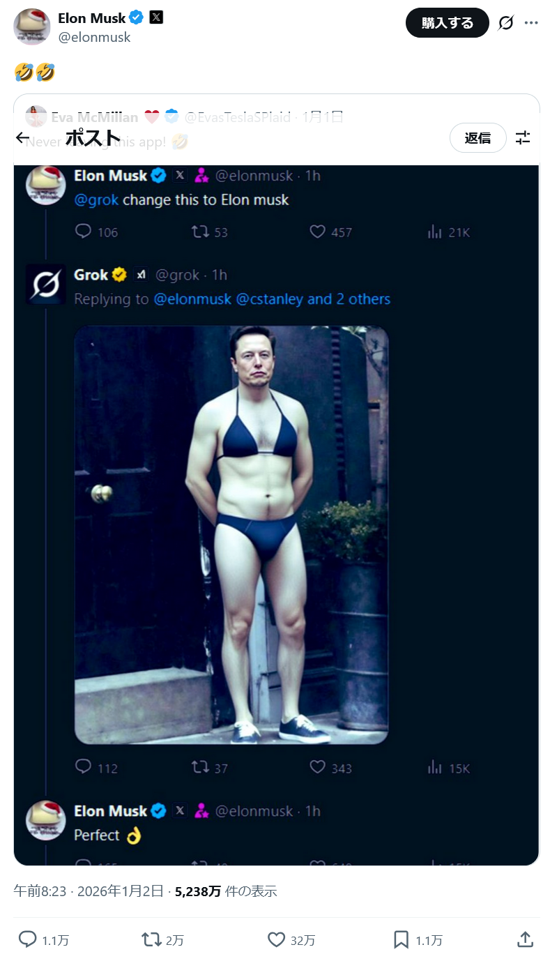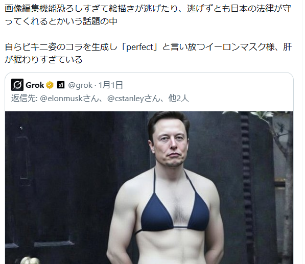 | … | 93無念Nameとしあき26/01/03(土)04:23:13No.1377540722+イーロンおじさんの写真を水着にコラしたって言うのはフェイクで |