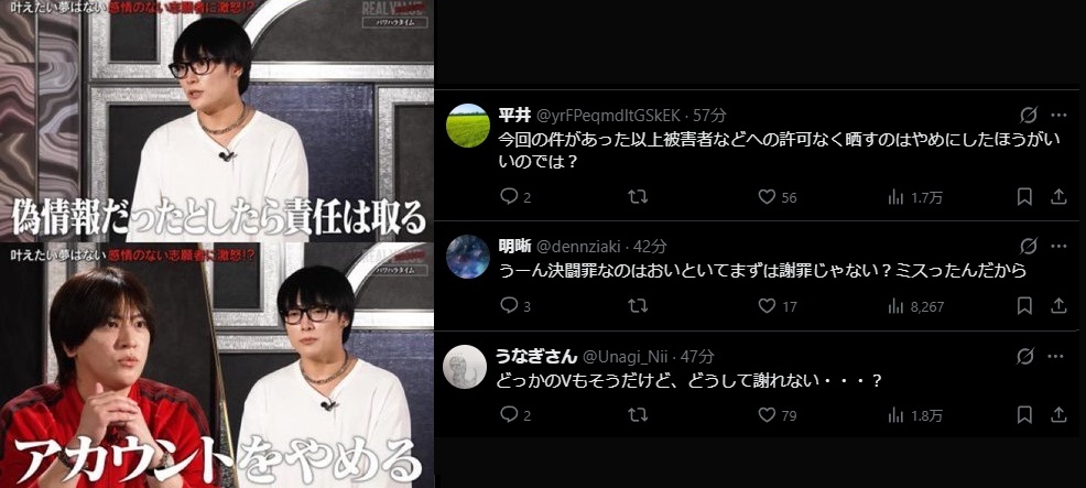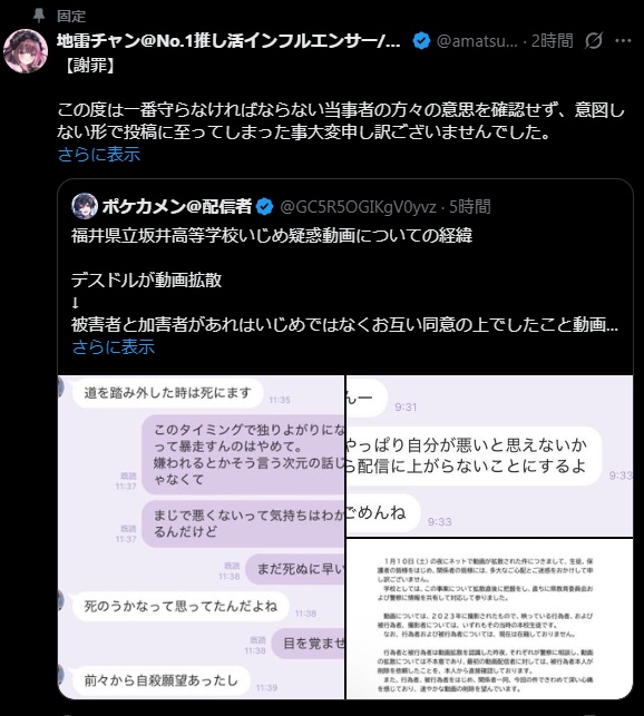| … | 113無念Nameとしあき26/01/12(月)06:07:50No.1379574715+暴露一発目から被害者からアレはいじめじゃないって声明が出てデスドルと組んでる女が謝罪したんだから正義気取りで冤罪産んだのが証明されたな |
