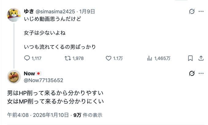 | … | 82無念Nameとしあき26/01/12(月)03:02:23No.1379568669+問題は優勢の方を加害者として拡散したことで |