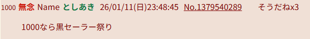 | … | 5無念Nameとしあき26/01/11(日)23:58:25No.1379542588そうだねx6 1768143505003.png-(1842937 B) >1000なら黒セーラー祭り |