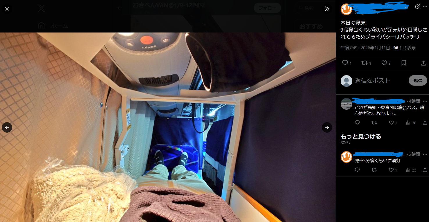 | … | 157無念Nameとしあき26/01/12(月)07:27:25No.1379577976+ 1768170445837.jpg-(254920 B) >ちょっと前に話題になった「日本初のフルフラット夜行バス」 |