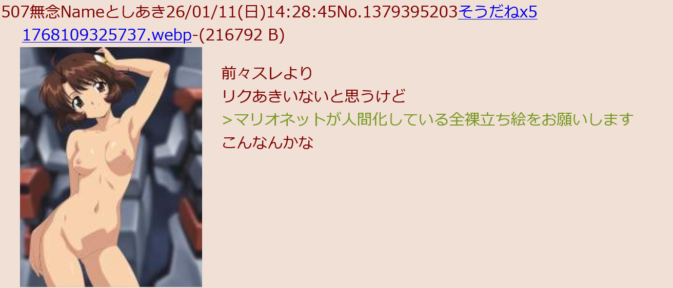 | … | 37無念Nameとしあき26/01/12(月)03:41:51No.1379570805+ 1768156911185.jpg-(229734 B) この子が服ビリされてるところをお願いできないでしょうか |