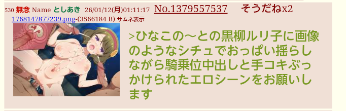 | … | 4無念Nameとしあき26/01/12(月)03:28:22No.1379570164そうだねx5 1768156102792.png-(1495206 B) >1000ならメスガキ祭り |