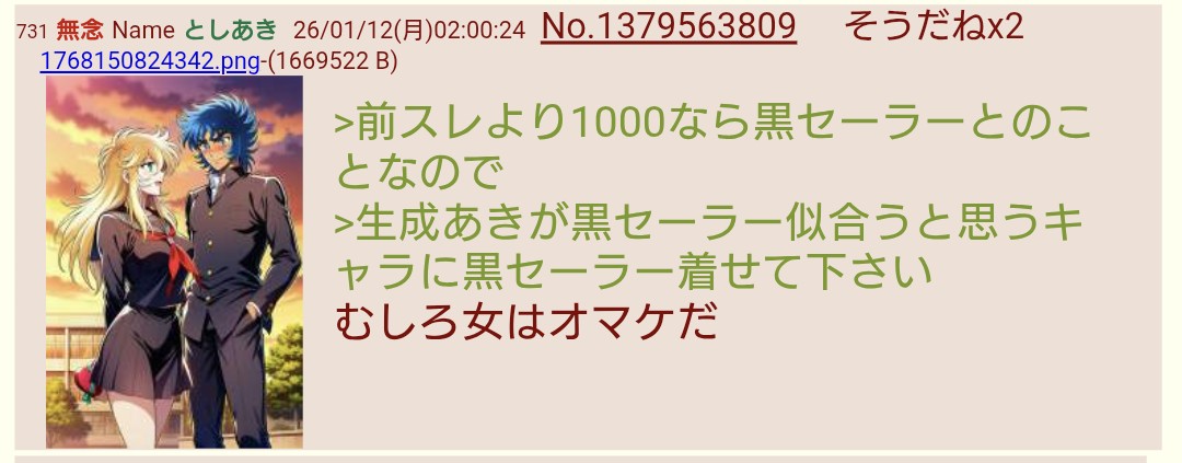 | … | 586無念Nameとしあき26/01/12(月)09:06:54No.1379587565+ 1768176414832.png-(1425511 B) おとなの制服もいいけど |
