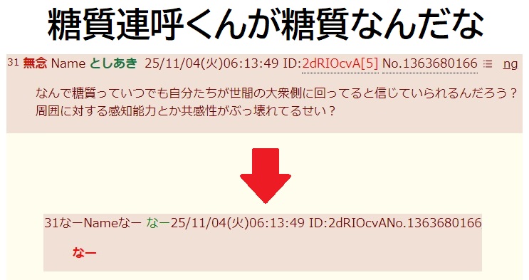| … | 59無念Nameとしあき26/01/12(月)06:27:39No.1379575383そうだねx4糖質連呼 |