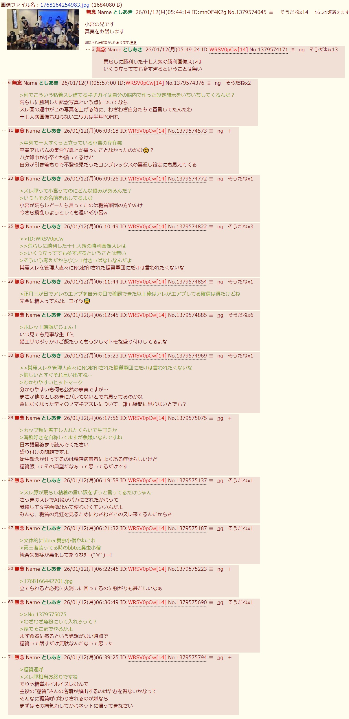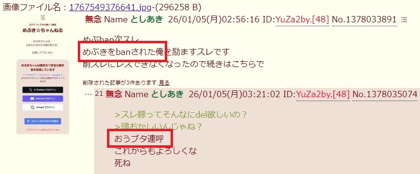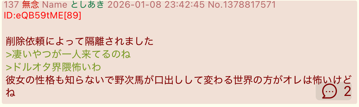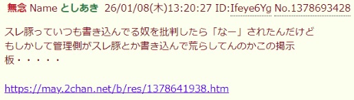| … | 51無念Nameとしあき26/01/12(月)06:23:05No.1379575233そうだねx2>文体的にbbtec糞虫小僧やねこれ |
