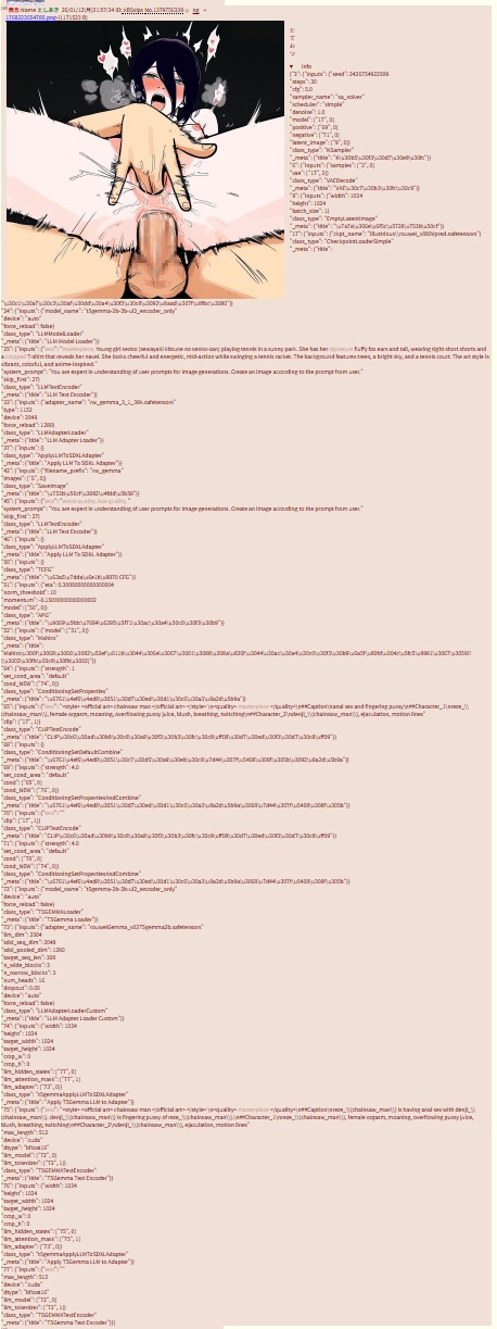 | … | 581無念Nameとしあき26/01/13(火)02:58:38 ID:HWR2EjvINo.1379808815そうだねx2通常プロンプトとネガティブプロンプトの両方で口酸っぱくして指定してる要素が絶対に反映されない時あるのマジでイラつくな |