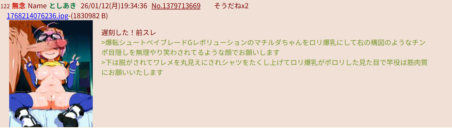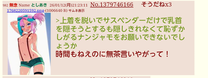 | … | 973無念Nameとしあき26/01/13(火)00:15:38No.1379792137+1000なら女の子としあき陵辱祭り |