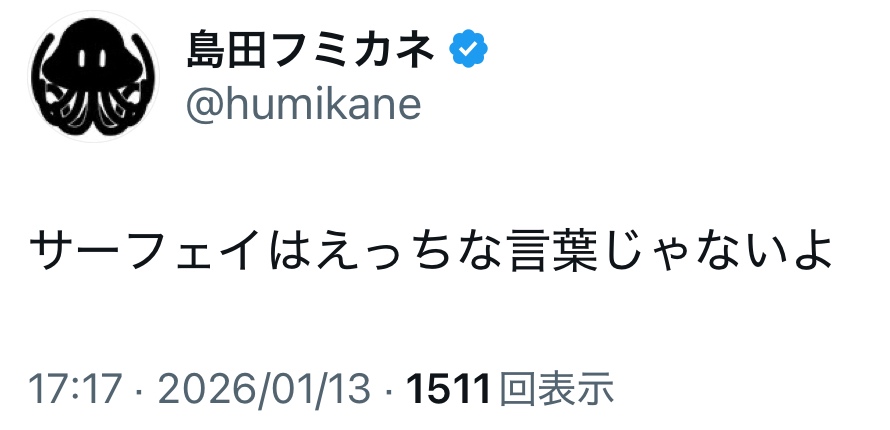 | … | 533無念Nameとしあき26/01/14(水)10:58:59No.1380042985+ 1768355939624.jpg-(134545 B) >サーフェイはやっぱりドスケベな言葉っす |