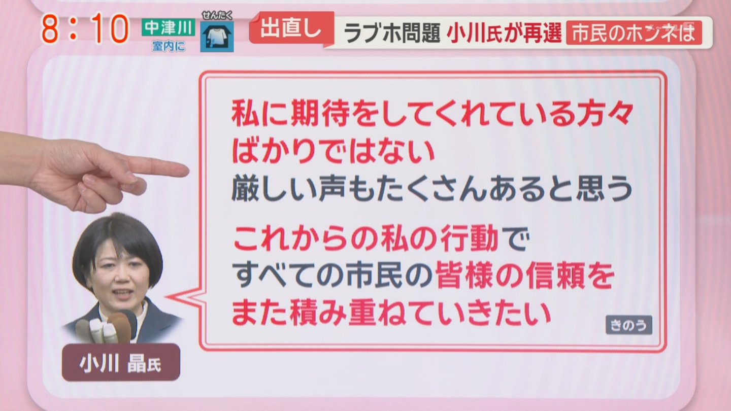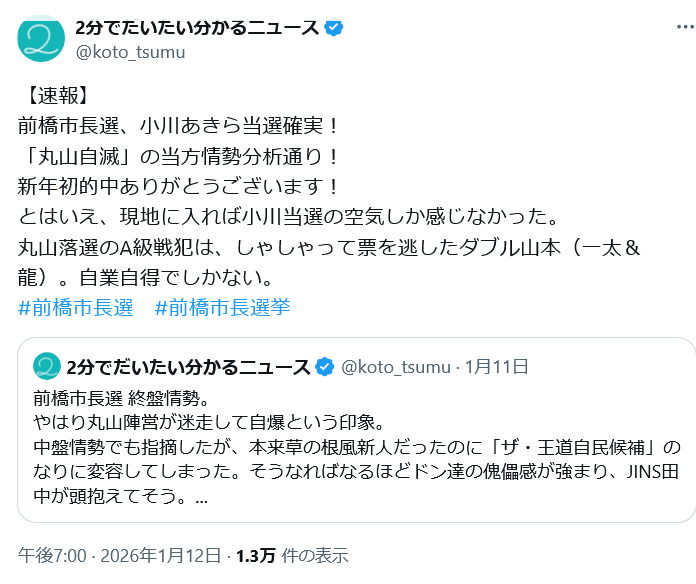 | … | 507無念Nameとしあき26/01/14(水)10:33:54No.1380039735+ラブホ密会騒動の小川晶氏、前橋市長選で再選…出直し立候補 開票から数分で吉報 |