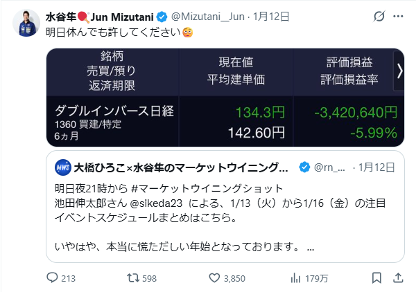 | … | 922無念Nameとしあき26/01/14(水)10:03:16 ID:i7dzvTP2No.1380035906そうだねx14万円しか持ってない日経レバレッジダブルの含み益が1万を超えたので |