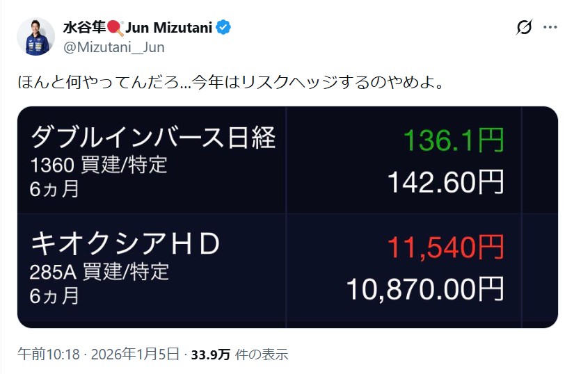 | … | 63無念Nameとしあき26/01/14(水)02:00:42 ID:Gkmdjb.kNo.1380009777+>>リスクヘッジやめようとかそういう事じゃないはずなので… |