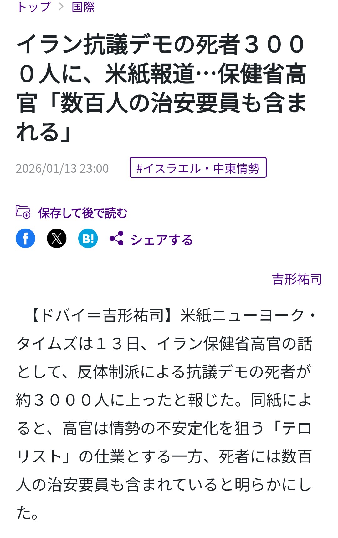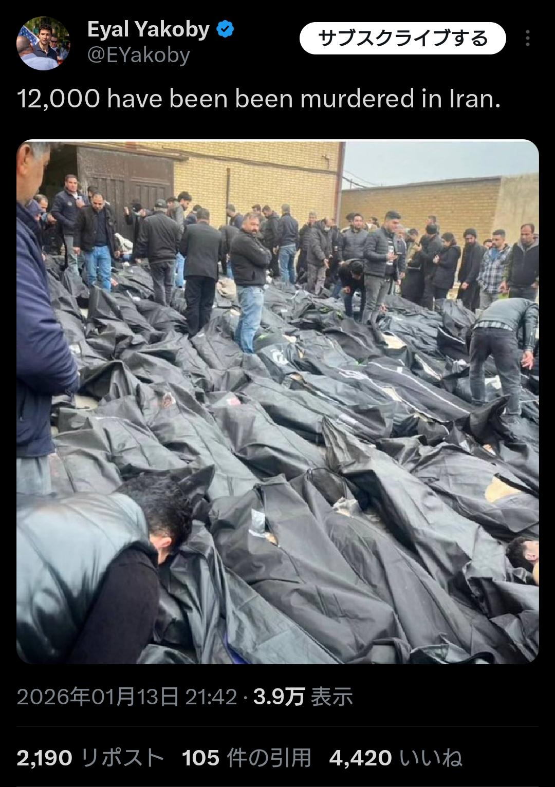 | … | 57無念Nameとしあき26/01/14(水)01:20:39No.1380006021+>>治安部隊側の死者も100人越えてるってイラン国営放送で言ってたらしい |