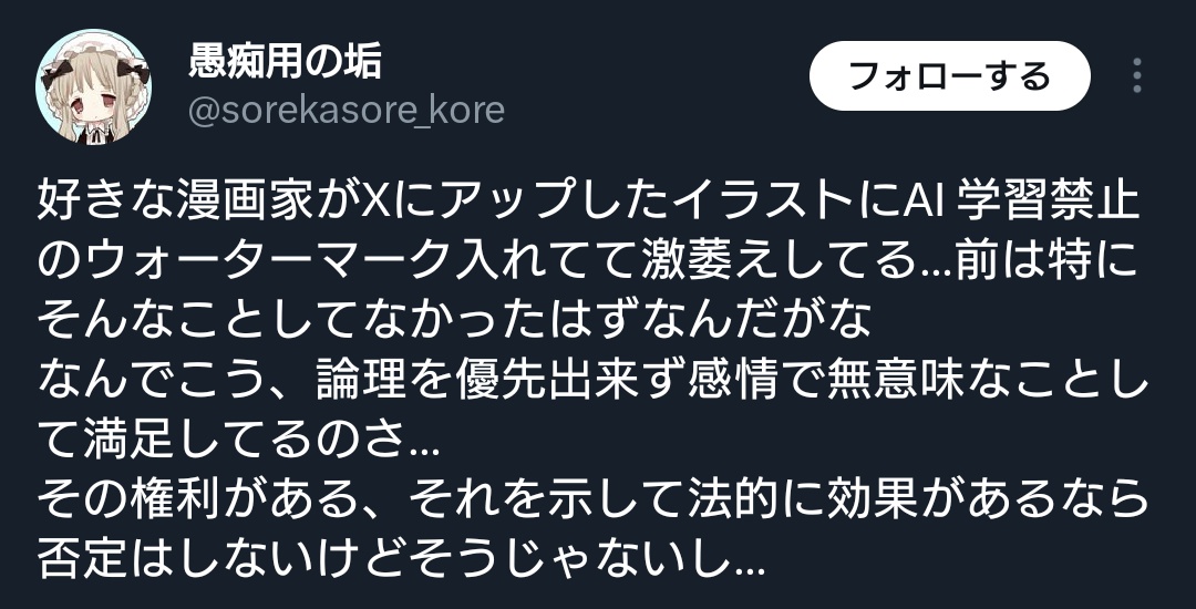 | … | 264無念Nameとしあき26/01/14(水)11:05:08No.1380043760+ 1768356308343.jpg-(210908 B) ウォーターマークや学習禁止鳥言えば前にコレが大炎上してたが、このポスト主自身もAI学習でかなり損した側の人間なんだよね |