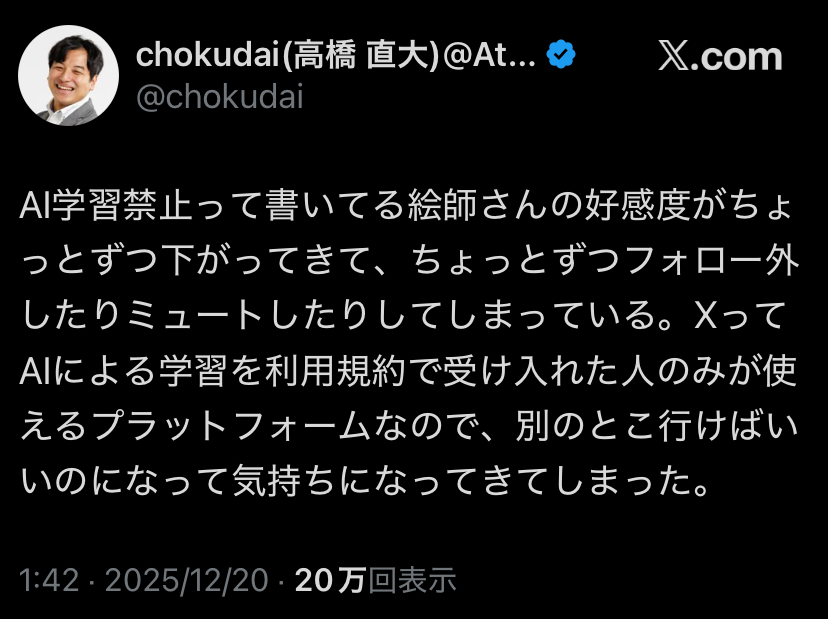 | … | 206無念Nameとしあき26/01/14(水)08:36:07No.1380027332そうだねx1これってAI学習されたくないなら承認欲求のためにXなんかにアップすんなよってことじゃないの |