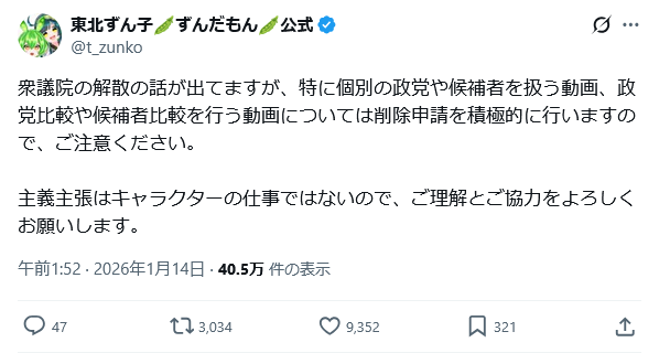 | … | 27無念Nameとしあき26/01/14(水)11:45:57No.1380048975+ゆっくりも規約違反の政治動画に使われまくってるしな |