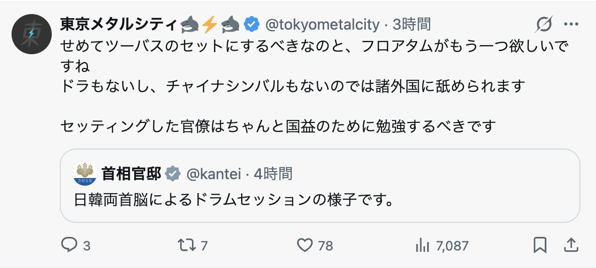 | … | 91無念Nameとしあき26/01/14(水)11:58:08No.1380050695+高市総理ドラムセッション!日本は韓国に謝罪しろ!! |