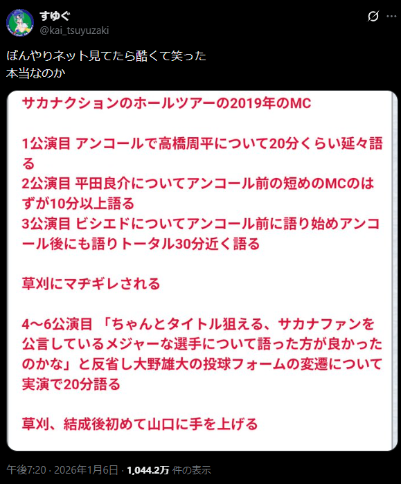 | … | 83無念Nameとしあき26/01/14(水)18:29:12No.1380113041+地下アイドルファンの相談で最終的にサカナクションを薦め始めたの面白かった |