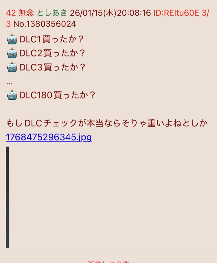 | … | 91無念Nameとしあき26/01/15(木)20:22:11 ID:9MZhg7woNo.1380360222+DLC買うと有無チェックが軽くなるってどういうことだろう |