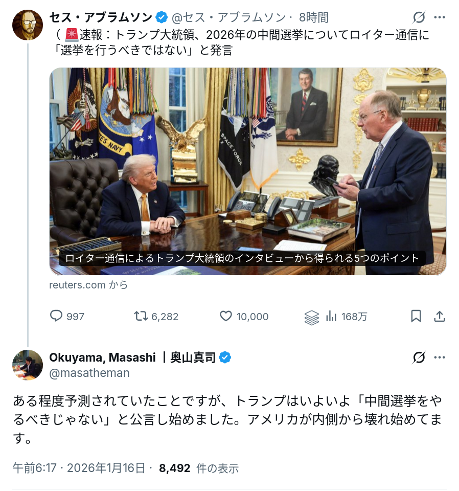 | … | 114無念Nameとしあき26/01/16(金)08:46:35No.1380458959+中間選挙やらないっていう帝国主義的なアメリカと |