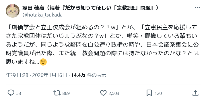 | … | 43無念Nameとしあき26/01/17(土)12:43:33No.1380727634+立正佼成会と創価学会と統一教会のブレンドだけど各信者は平気なの?殺し合い起きない? |