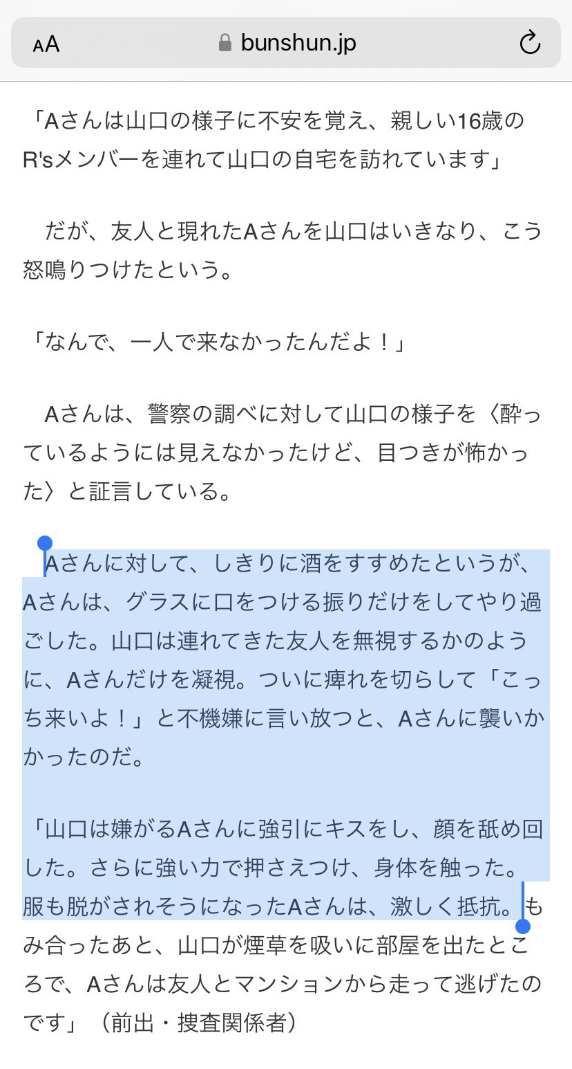 | … | 95無念Nameとしあき26/01/17(土)13:19:08No.1380735502+初めの詳細な報道では山口と名前の出ない裏方の2人から山口の家に夜の食事でメンバー2人呼び出されて未成年だから親が親の車で送り届けた |