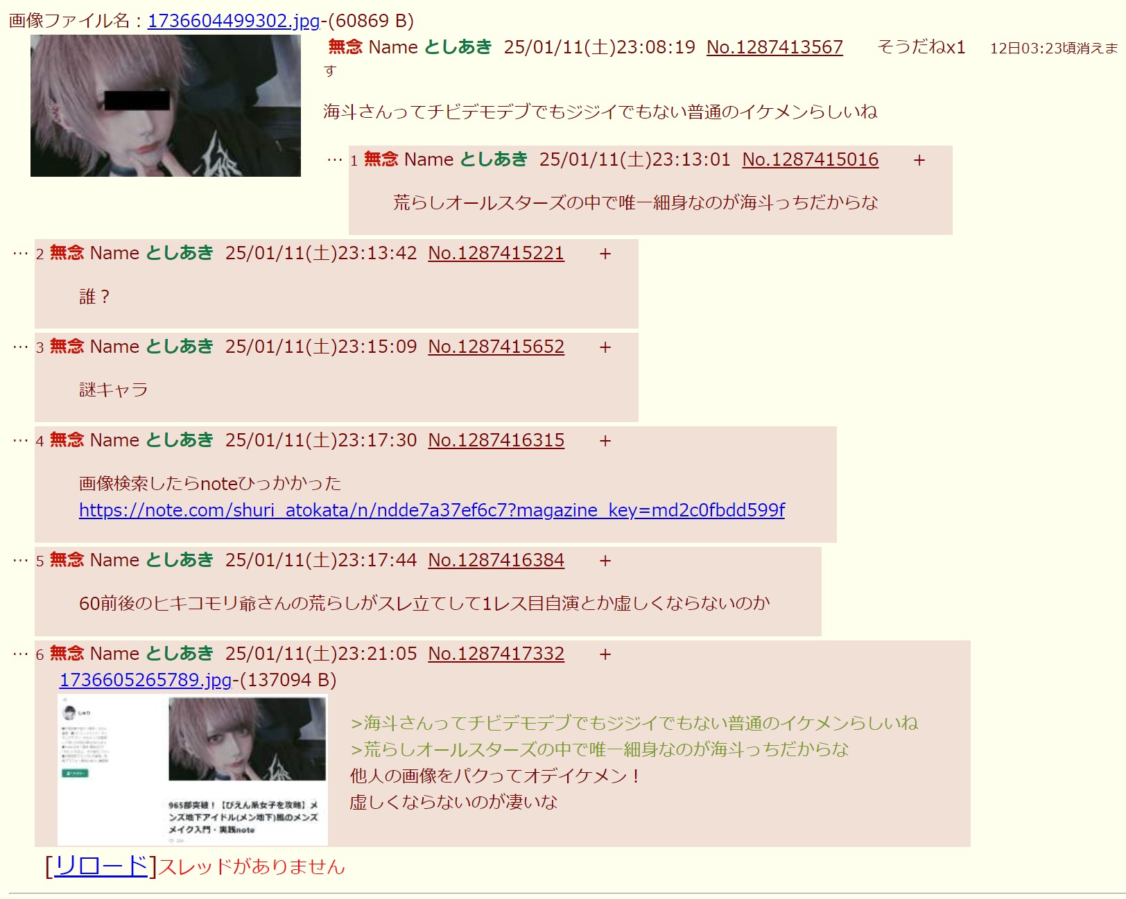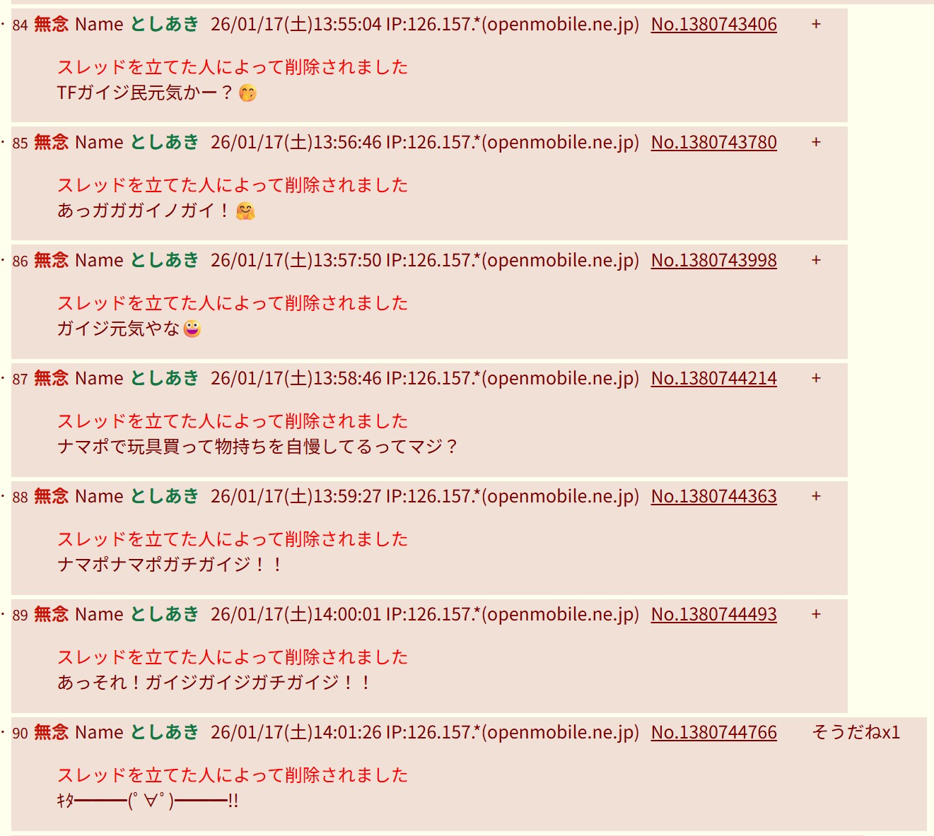 | … | 108無念Nameとしあき26/01/17(土)16:17:46No.1380772168+>馬鹿が罵倒に耐えられず消した無様貼っとくわ |
