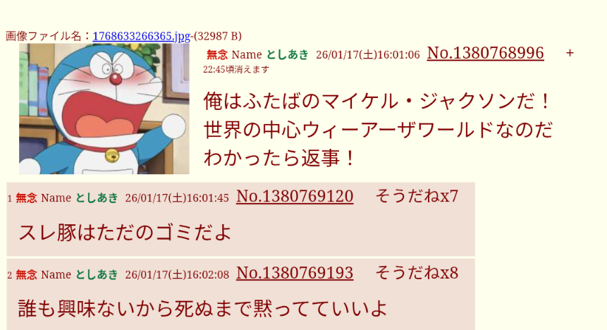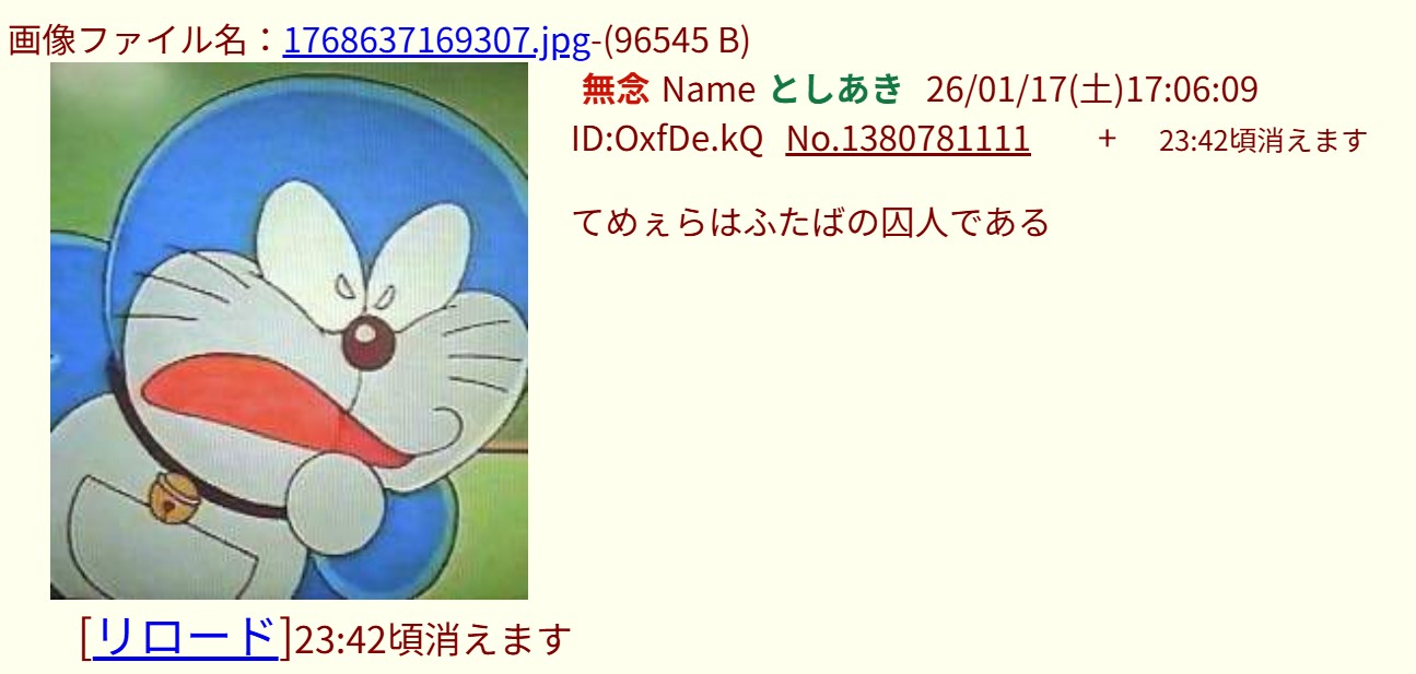 | … | 132無念Nameとしあき26/01/17(土)17:03:22No.1380780585+ 1768637002354.jpg-(119788 B) >ドラえもん始まる頃に何かスレ立てそうだな |