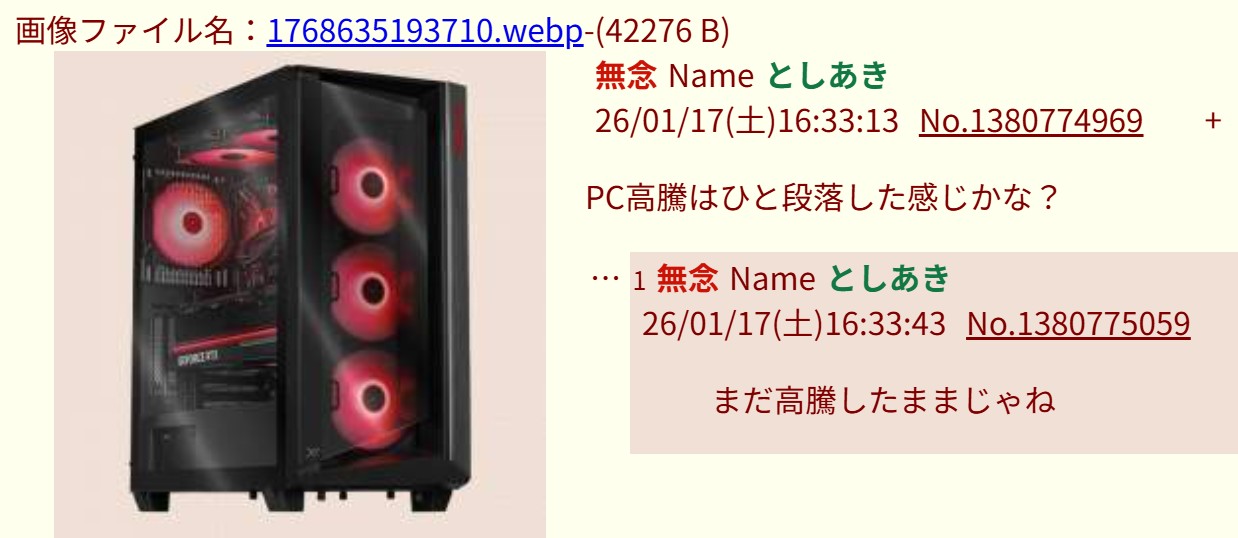 | … | 127無念Nameとしあき26/01/17(土)16:44:43No.1380777106そうだねx2PS5も欲しくて溜まらないのかずっと立て続けてるね |